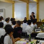 午前中は教養部棟をお借りして、農業関係の学科を持つ県内8校から大学進学を目指している生徒たち25名が集まり、合同勉強会「夢・みらい塾」を開催。本年度は本校の先生方が企画・運営を担当しました。本校からも1~3年生の6名が参加。岡山大学に通われている先輩方の体験談を聞いたり、外部講師による小論文の書き方や自己推薦文・面接対策ゼミに取り組みました。