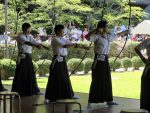 4月22日(土)23日(日)に岡山県弓道大会が吉備津弓道場で行われました。試合方法は、5人団体で、1人4射を2回行った合計40射の的中数でベスト8を決めます。そして、8校が決勝トーナメントで順位を決める大会です。