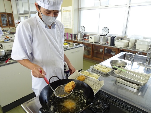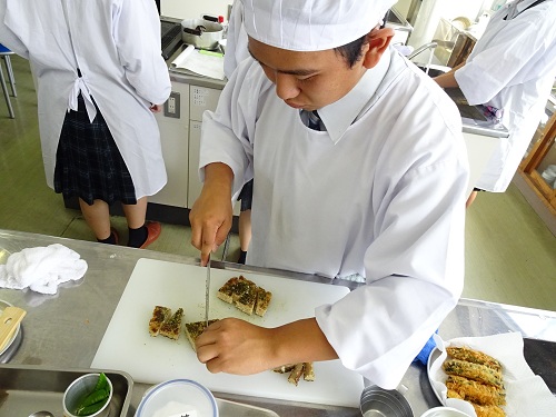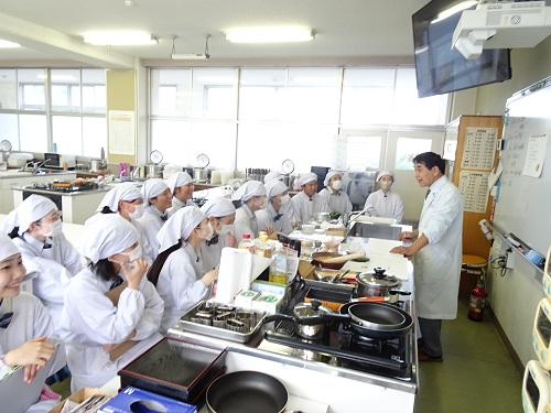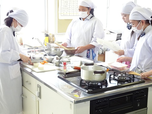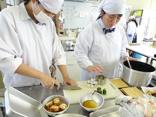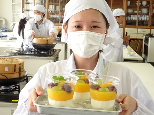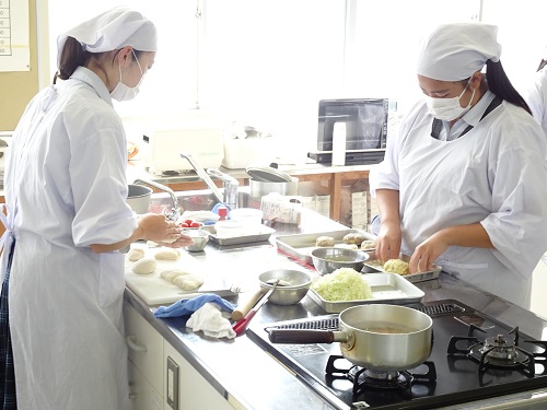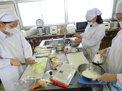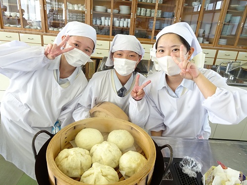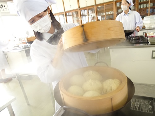 調理の授業で「小麦粉講習会」、「瀬戸南の桃を使った実習」を実施しました。「小麦粉講習会」では「ふわふわ豆乳パン・たっぷり野菜のコンソメスープ・牛肉コロッケ・ガトーショコラ」を作りました。豆乳パンはふわふわに仕上がり、牛肉コロッケは生パン粉を使ってサクサクにできあがりました。また本校の桃を使って、「紅茶と桃のパウンドケーキ・パンナコッタ」と「包子」を作りました。手作りの「包子」は蒸籠を使って蒸し上げ本格的な味でおいしくできあがりました。