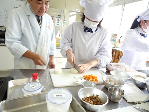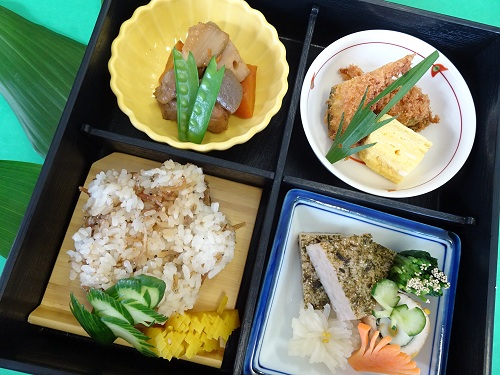 10月8日(水)政木信昭クッキングスクール校長の政木先生をお招きし、「日本料理講習会」が行われました。日本料理の基礎を学び、松花堂弁当を作りました。献立は「ごまじゃこご飯、炒り鶏、ささみの孔雀ロース、南京の重ね揚げ、鶏ひき肉の末広焼き、だし巻き卵、菊花大根」でした。彩りもよく、とても上品で美味く出来上がりました。講習会で学んだことを生かして、おもてなしの「松花堂弁当」を心を込めて作っていきたいと思っています。