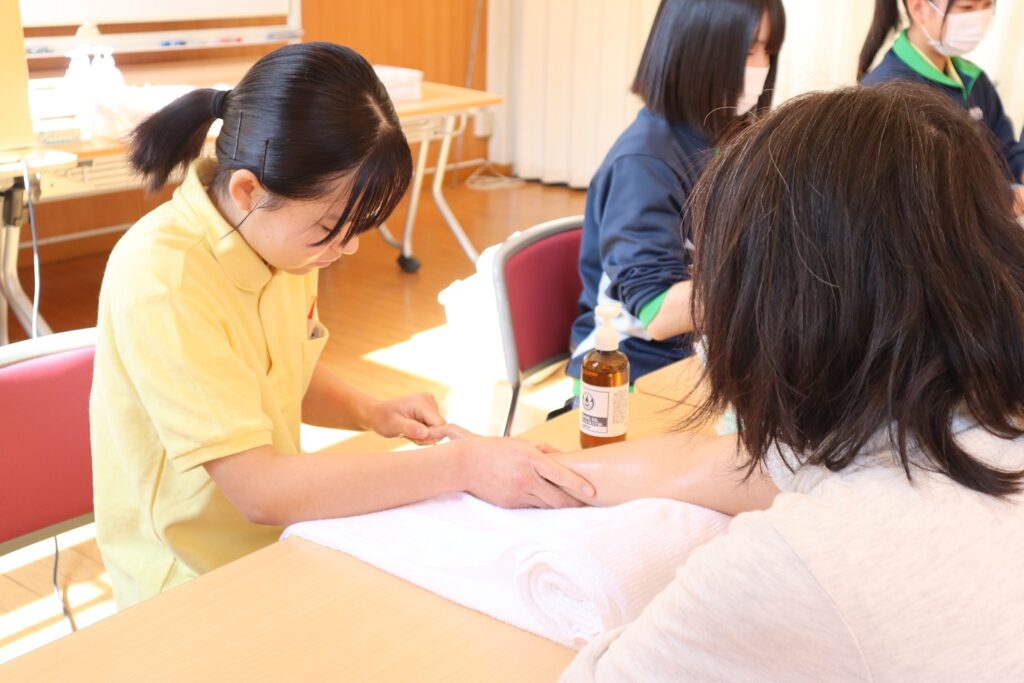11月15日本校で行われたシクラメン祭り。生活デザイン科からは福祉コースがハンドマッサージコーナーを、保育コースはキッズコーナーと被服小物と米粉シフォンケーキの販売を担当しました。