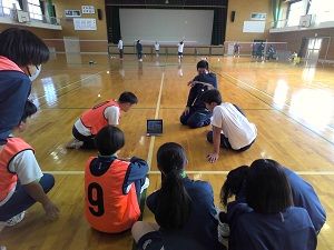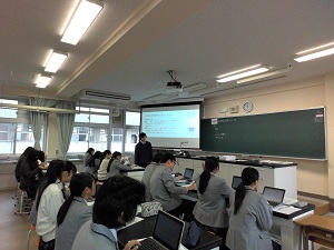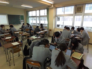 11月には、「端末を活用し、他者との交流を通し、自分の考えを広げ、深める」ことをテーマに掲げ、校内で公開授業を行いました。動画撮影後の振り返りや、共同編集での思考の共有、生徒がAIに問題を作成させて個別最適な学習をするなど、授業の目標に沿った端末活用が進んでいます。また、端末活用や授業の振り返りについての教員研修を行いました。