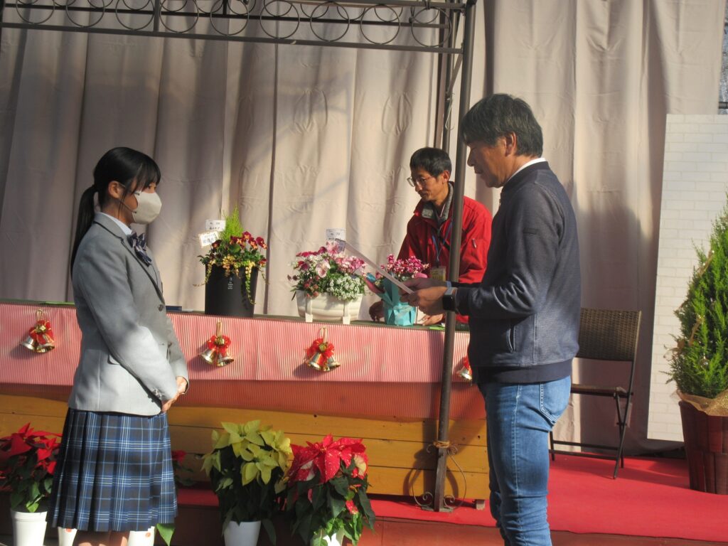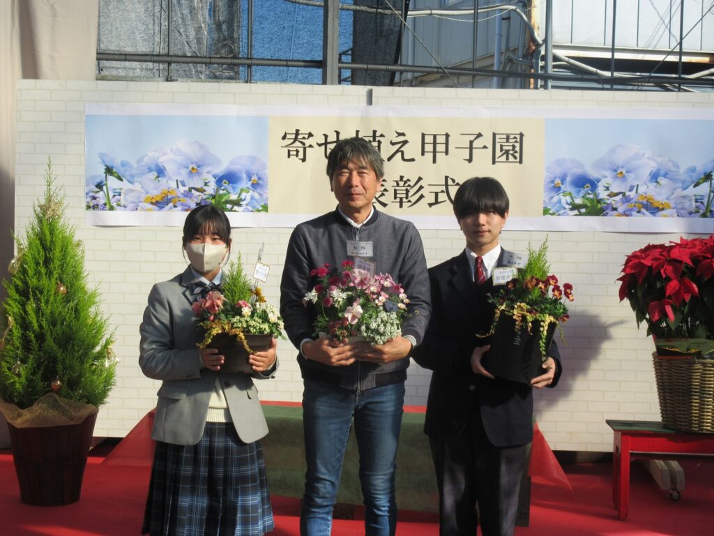 11月29日(土)。園芸科学科2年生が、農マル園芸吉備路農園で開催された「寄せ植え甲子園表彰式」に参加しました。11月6日(木)に出場した寄せ植え甲子園で作製した寄せ植えが見事「農マル賞」に輝き、NHKの「趣味の園芸」等でも知られる矢澤先生から賞状をいただくことができました。