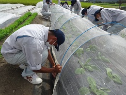 園芸科学科野菜園芸類型3年生が、来年度の栽培の準備として、露地圃場へ堆肥を散布しました。堆肥を畑の全面に広げ、排水をよくするために平グワで溝を掘りました。この露地圃場は今後2年生が引き継ぎ、来年度の交流学習に向けて準備を続けていきます。