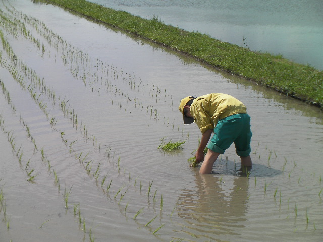 ①生物生産科 田植え始まる! 2012年6月22日 setomina01 6月22日、生物生産科栽培類型3年生が、今年最初の田植えを行いました。最初に植え付けた田んぼは、生徒が課題研究で安全で美味しい米作りに取り組んでいる場所です。農薬を使っていない水田に無農薬で育てた苗を田植機で植え、少し曲がった所は手植えで対応しました。約1.8haある水田は、この後次々に田植えを行います。そして来週には江西小学校5年生を迎えての田植え交流を予定しています。