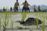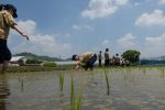 生物生産科栽培類型の3年生が機械植えをする中、生物生産科の1年生40名が手植えの学習を行いました。担当は本校3号水田の「キヌムスメ」です。2名の田植え綱係が植え付ける幅を決め、約60mの畝に残りの38名が等間隔に整列し、水田に入っていきます。田植え綱のセッティングが終わったら一斉に植え付けます。綱に沿ってきれいに植えることに集中しました。その他にも機械植えの欠株を補植し、3号田の田植えが終了しました。生徒は「楽しい」「しんどい」「手作業は大変」など、様々な感想を持っていましたが、機械が普及する前は手植えだったこと、農家の人の苦労があって「白いお米」を口にすることができているのだということを学ぶことができました。「いただきます」「ごちそうさま」 この言葉の重みをしっかりと理解したようでした。