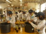 本校には「ラベンダー通り」という通りが体育館の南側にあります。梅雨の時期にラベンダーの紫色の穂が立ち揃うきれいな通りなのですが、植え替えて5年も経つと生い茂り、花壇からはみ出たり折れたりします。6月14日(金)、園芸科学科1年B・C組の1班が草花の総合実習の時間でラベンダー通りの定植を行いました。昨年の6月に挿し木をした220ポットの苗も伸びきっていたので、軽く切り戻して定植しました。まだ、元気ではありませんが、梅雨を経験して根を張らせ、秋には紫色の小さな穂が出るように、灌水や施肥を実習で行いながら育てていきたいです。
