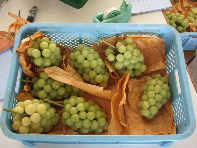 ②園芸科学科 瀬戸ジャイアンツの収穫 2012年9月7日 setomina01 9月7日(金)の実習風景です。緑系のブドウの瀬戸ジャイアンツが熟していて、この日も実習で収穫しました。この品種は糖度も甘く種もないですがですが、他の品種と比べても特に食べやすく次々食べられます。緑系ではこの他、同じく種のないシャインマスカットや、また糖度が20度近くのマスカット・オブ・アレキサンドリアも収穫しています。収穫したブドウは選果室に運んで重さを量り、市価よりも安く校内で販売しています。9月いっぱいは収穫しています。