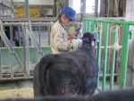 子牛の体重測定を行いました。今回挑戦したのは、1年生です。まだまだ慣れておらず、ウシに振り回されながらもどうにか体重計まで誘導していました。そして、体重を量り終えたウシをブラッシングしました。見た目をきれいにするだけでなく、ウシが人に慣れることで飼いやすくなります。あったかいタオルで顔や耳を拭いてあげると気持ちよさそうにしていました。