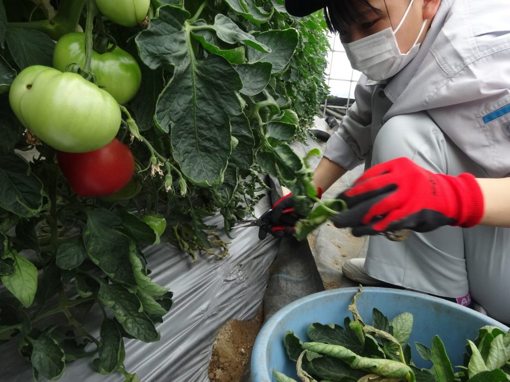 ②園芸科学科 野菜だよりVol.36「2年生課題研究」 2021年6月6日 setomina01 6月3日。 今日は、園芸科学科野菜園芸類型2年生で栽培している、大玉トマト「麗夏」の古い葉を下からとる「下葉かき」を行いました。今年は梅雨が早いので、例年より少し早くこの実習を行いました。