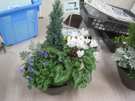 10月28日に農マル園芸吉備路農園で行われる「寄せ植え甲子園」に参加します。時間と材料を規定内で寄せ植えを作り、お客様の人気投票で、順位が決まります。今回、自分たちで人気投票を行いました。5日前に作った寄せ植えに名前を伏せて番号で投票しました。ナンバー1の作品は「NO.7」の作品でした。コニファーとシクラメン、ビオラ等のバランスが良いと高評価でした。この調子で本番も頑張ります。