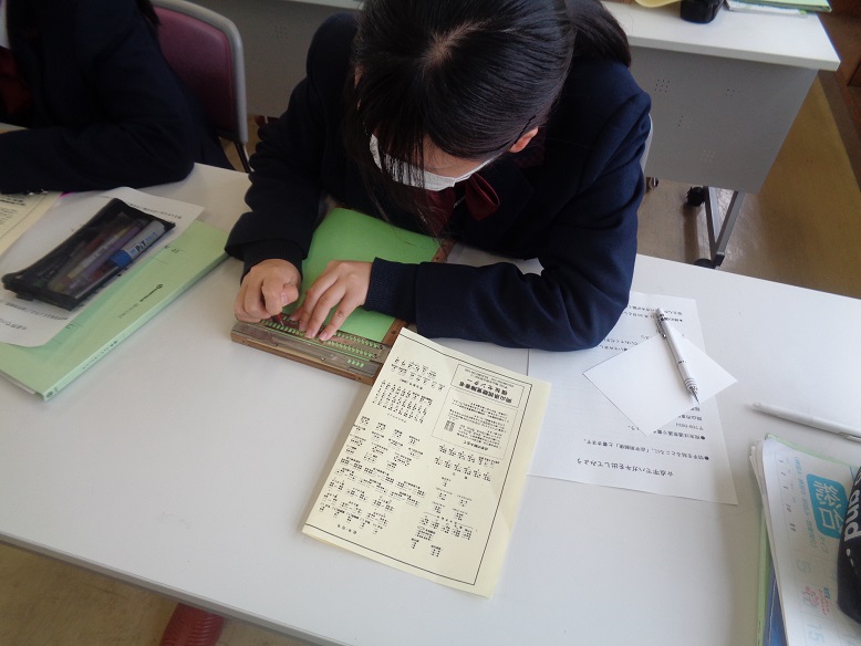 11月10日、コミュニケーション技術の授業の一環で、外部講師として福原先生に来ていただき、点字について学びました。2回目の講習会となった今回は、実際にクリスマスカードを作りました。点字郵便と書かれたはがきに宛名を書いた後、それぞれの生徒が、福原先生への文章を考えて打っていました。読んでいただくのが楽しみです。