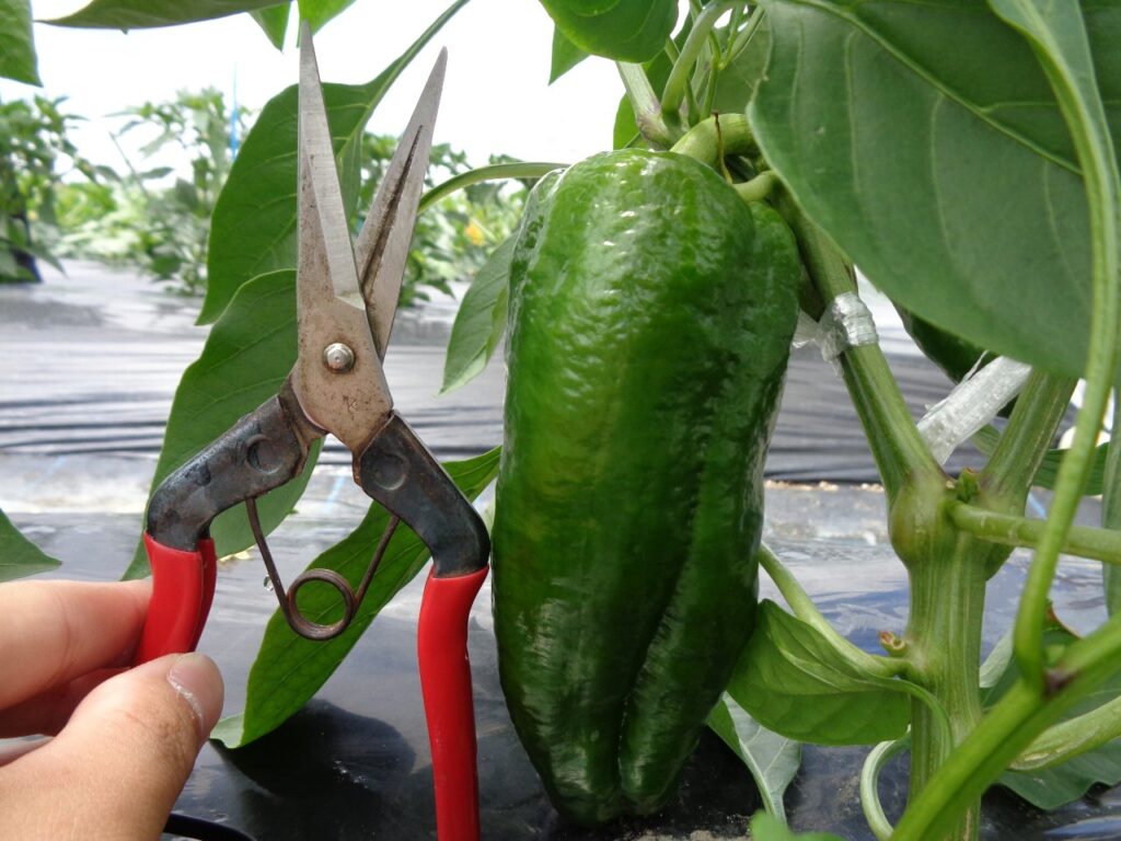 ②園芸科学科 野菜だよりVol.51 3年課題研究 2022年6月9日 setomina01 6月7日。 3年生の「課題研究」の授業で、ジャンボピーマンの収穫と甘トウガラシの日焼防止に寒冷紗をかけました。また、トマトの裂果防止のために茎をペンチでつぶす試験を行いました。