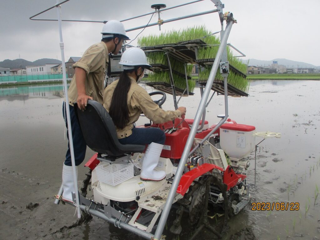 6月23日。2年栽培類型の「作物」と「総合実習」の授業で、日立造船製の自動操舵システムを取り付けた、みのる産業製のポット苗田植機を用いて田植えを行いました。機械の操作方法はお米プロジェクトに取り組んでいる「Pioneer R.G」のメンバーが中心となり、教え合いながら行いました。自動操舵による直進性能で生徒が自分で操作して植えるよりも、きれいにまっすぐ植え付けることができました。
