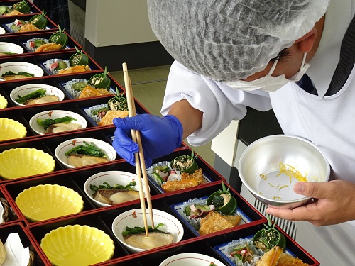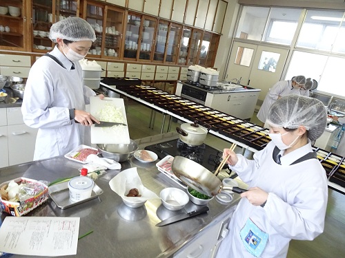 11月26日(水)、生活デザイン科3年生「調理」の授業で会食実習を行いました。先生方を調理室にお招きし、松花堂弁当を作っておもてなしをしました。