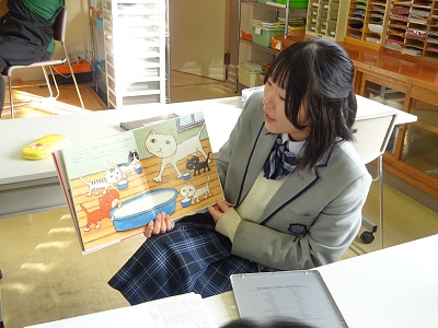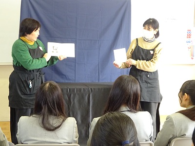 絵本の読み聞かせボランティアを行っている、かなちゃんとちゃーさんのお二人の先生方をお迎えし、「冬のおはなし会」をしていただきました。手遊び歌なども交えながら、季節にあった絵本や、めずらしい絵本など多数の絵本を紹介していただき、保育の実習に取り入れていきたいと思いました。わくわくしたり、ドキドキしたり心から楽しめる時間になり、ほっこりした気持ちになりました。