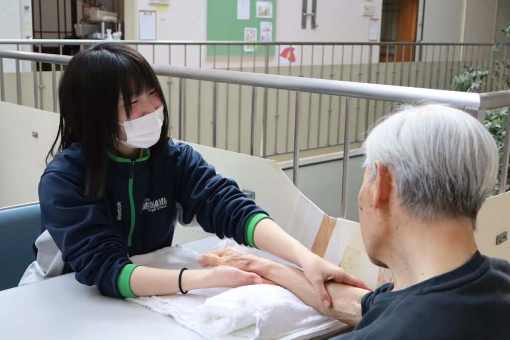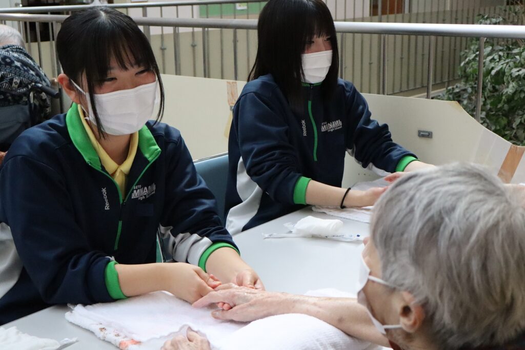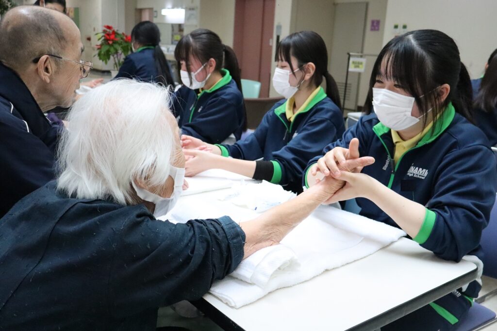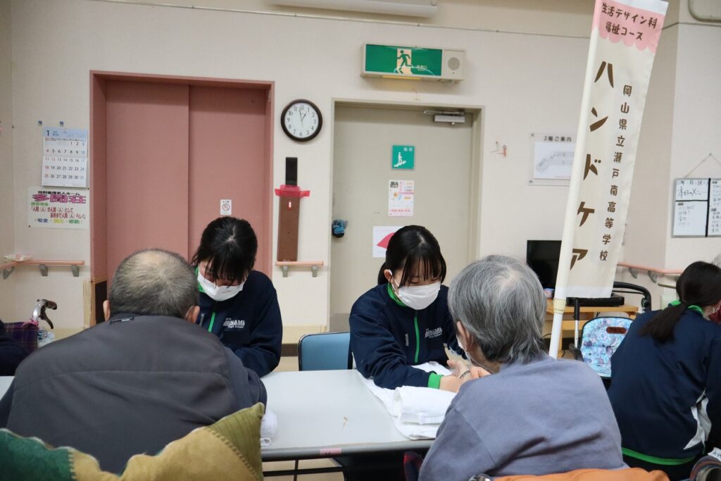 ③生活デザイン科, 福祉コース 特別養護老人ホーム多聞荘訪問(生活デザイン科3年) 2026年1月26日 setomina01 施設実習でお世話になった多聞荘さんへハンドケアをさせていただきに行ってきました。たくさんの利用者さんに施術を受けていただき、喜んでいただけました。