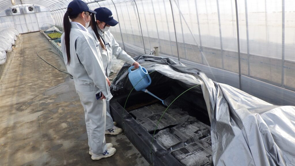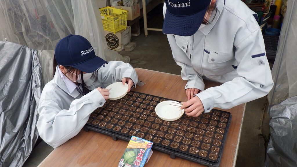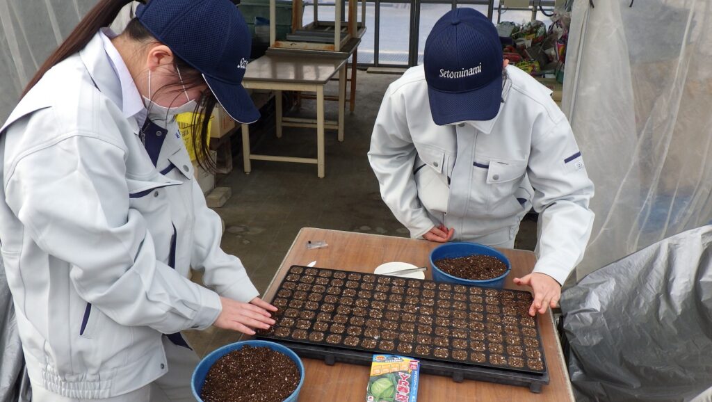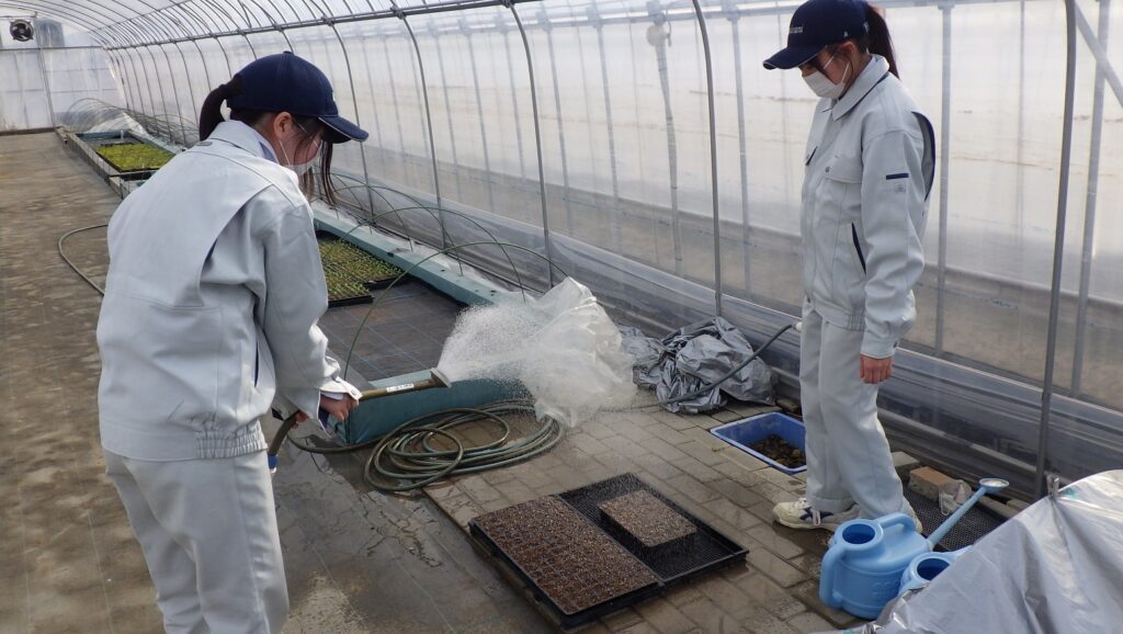 園芸科学科1年「この指とまれプロジェクト」で春キャベツチームを結成しました。最初の活動はキャベツの播種です。手順は①セルトレイに種まき用の土をいれて、ピンセットを用いて1粒ずつまく。②種をかくすように土をかぶせる。③土が流れないようにハス口の向きに気をつけながら水やりをする。④新聞紙をかけて、そのうえから水をかけ温床トンネルにセットする。キャベツの播種は初めてでしたが種がコーティングされていて作業がしやすかったです。これから全力で取り組んでいくので応援よろしくお願いします。