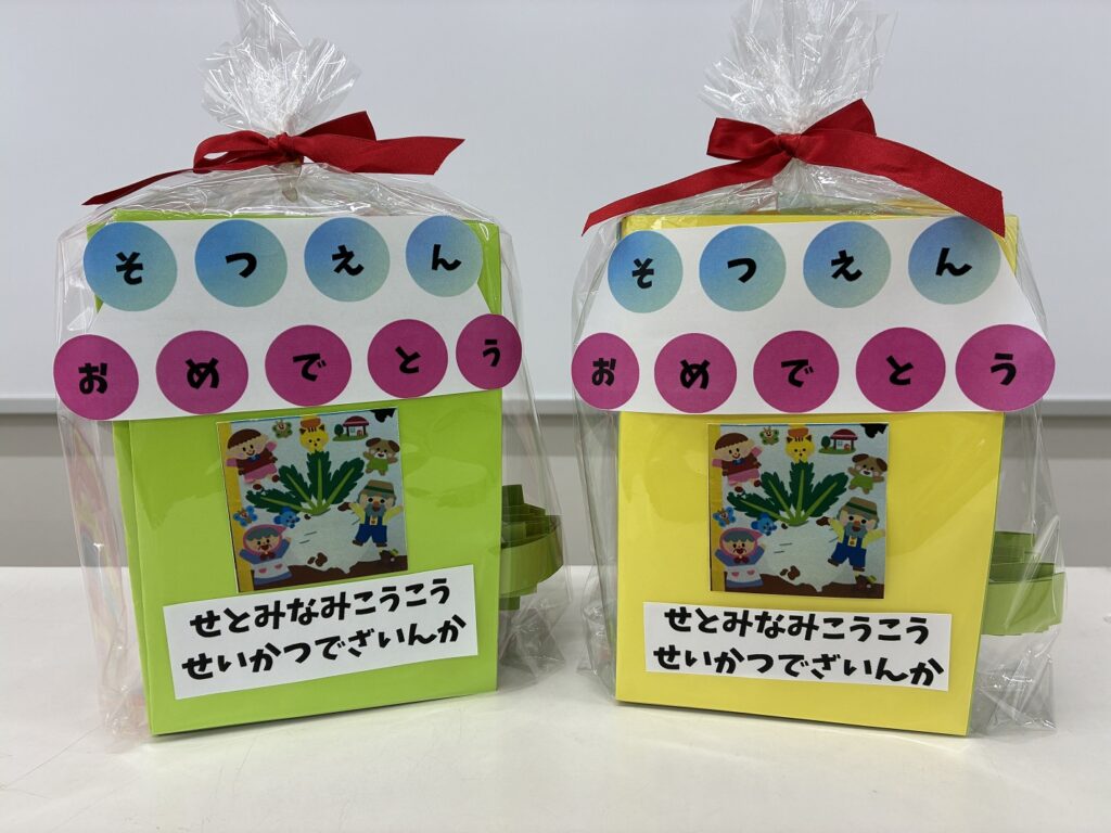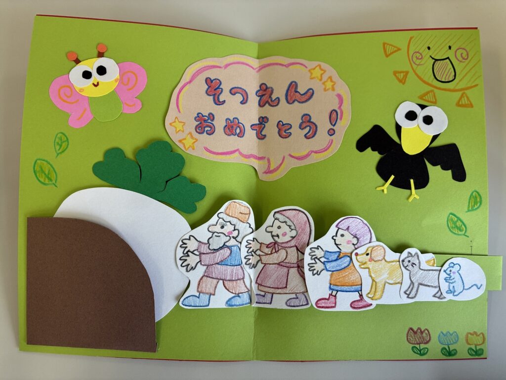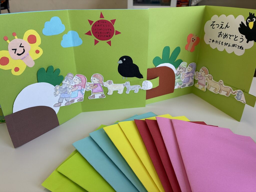 生活デザイン科3年生保育コースが2年間実習でお世話になった、江西桜こども園の年長さんに卒園のお祝いカードを作りました。最後の実習で披露したオペレッタ「おおきなかぶ」。「よいしょ、こらしょ、よいこらしょ!」一緒になってかぶが抜けるところを楽しんでくれた場面をカードにしました。ねずみの端を引っ張るとかぶが動きます。