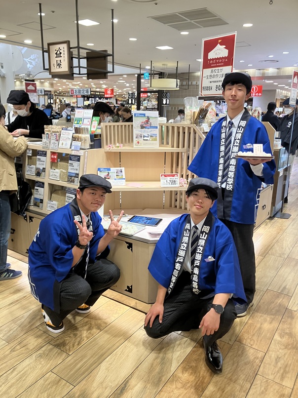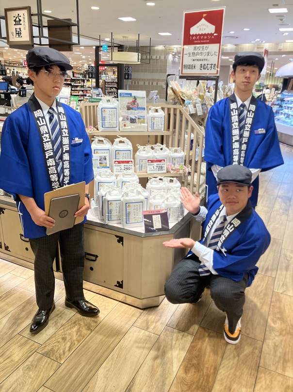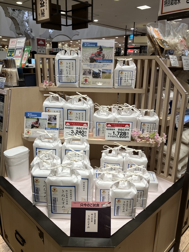 3月19日。ライスコース2年生の3名が阪急百貨店うめだ本店にある米処四代目益屋で店頭販売を行いました。多数回中耕除草技術を用いて肥料も農薬も使用せず栽培したこだわりの「きぬむすめ」を販売しました。午前中は客足が少なく販売に苦戦しましたが、自分たちがどのように栽培したお米か説明をしたりする中で少しずつお米を手に取るお客様が増えました。午後からはたくさんお買い求めになるお客様もいたことで予定時間よりも早く完売することができました。お客様と直接交流することで米作りのモチベーションがさらに上がりました。米処四代目益屋さんには大変お世話になりました。